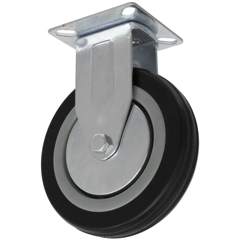 Economy range fixed plate castor. Durable rubber/polypropylene wheel with a steel centre.