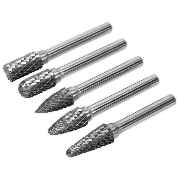 Rotary burrs manufactured from Tungsten Carbide with No. 6 cut (universal) with Cylindrical Front End Cut, Rotary Ball Nose, Arc Pointed Nose, Arc Round Nose, Conical Ball Nose shaped heads. For use on soft and hard metal, including welded seams. Supplied in plastic storage box.