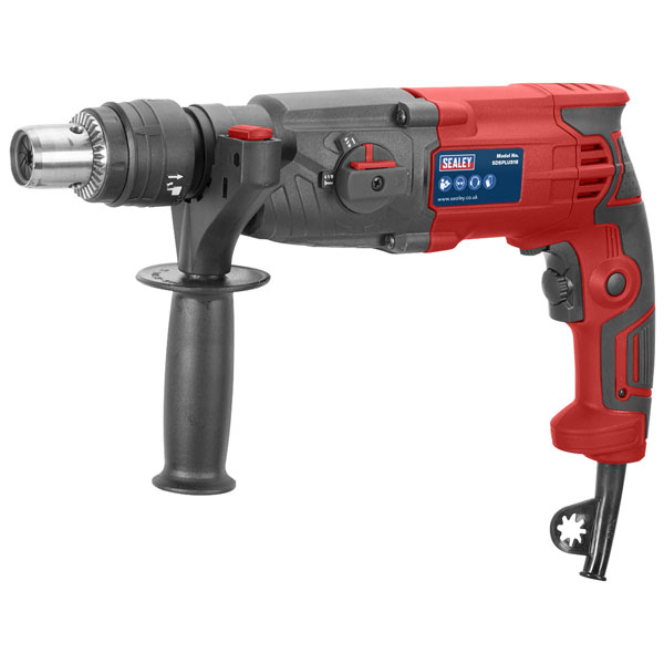 Powerful rotary hammer drill with patented double chuck. Chuck can be used with SDS, SDS Plus and HSS drill bits. Three drilling functions. Variable speed control trigger. LED Mains power indicator. Supplied in storage case with 8mm,10mm and 12mm masonry drill bits and depth gauge. Fitted with 360° auxiliary handle.