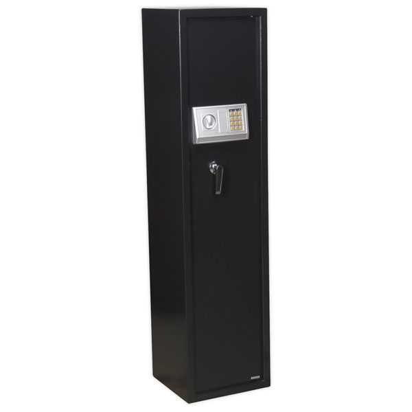 Powder coated paint finish to prevent corrosion. Cabinet door is evenly locked by five 25mm locking bolts, one top, one bottom and three along the side. Side walls and floor are carpeted to protect guns from damage when putting away or taking out of the cabinet. Cabinet includes a set of securing bolts with rear and bottom holes for fixing to the wall and floor. Features electronic keypad lock or can be opened manually with the override keys provided and two small keys for locking the internal ammunition safe. Manufactured in accordance with BS 7558:1992.