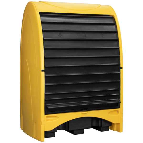 Two drum 250L spill pallet complete with weathertight hardcover, featuring either side entry via two sliding shutters.