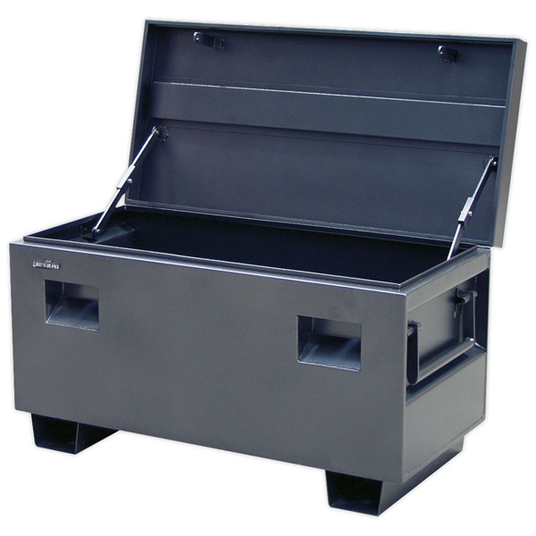 Manufactured from heavy gauge steel with seam welded joints. Folded lips add strength and rigidity. Enamel finish helps prevent corrosion. Box may be secured with a padlock hidden in recess at the front. Features two heavy-duty handles on either end of box for manoeuvrability. Lid is secured with locked arm when open. Fitted with welded feet allowing unit to be moved by forklift. Feet have pre-drilled holes for the option of securing in one place. Suitable for secure storage of tools and heavy equipment, on site, in vehicle, in the workshop or at home.