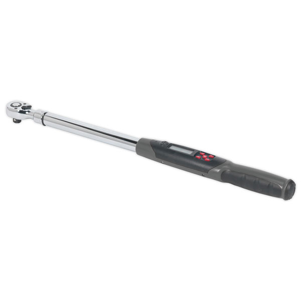 Rugged and resilient digital torque wrench suitable for workshop and factory use. LCD read-out with LED, vibration and audible alarms to indicate achieved and target torque levels. Features angle mode, eliminating the need for angle gauges and protractors providing an accurate and fast way to measure torque plus angle tightening sequences. Will also accumulate angle measurement when multiple turns are required, ideal for use where access is limited. Selectable track or peak modes and up to five user preset memories available. Read-outs in Nm, lb.in, lb.ft, kgf.m or degrees. Reversible Chrome Vanadium 72-tooth ratchet allows torque reading in either direction. Accurate to ±2% of wrench’s stated capacity. Supplied with test certificate and storage case.