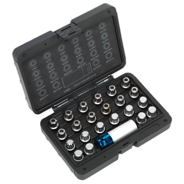 Set of 22 keys for the removal of spline and security ribe locking wheel nuts on VAG vehicles. Includes 17mm wheel nut socket with 1/2"Sq drive. For distribution to bona fide vehicle dealers and repair centres only.