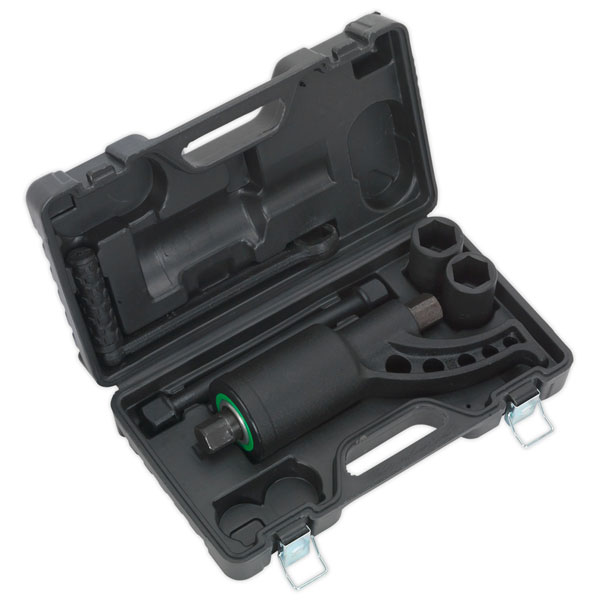Ideal for removing/installing wheel nuts on commercial and light commercial vehicles when air impact wrench is not easily accessible. Supplied in storage case with two impact sockets and 210mm extension.