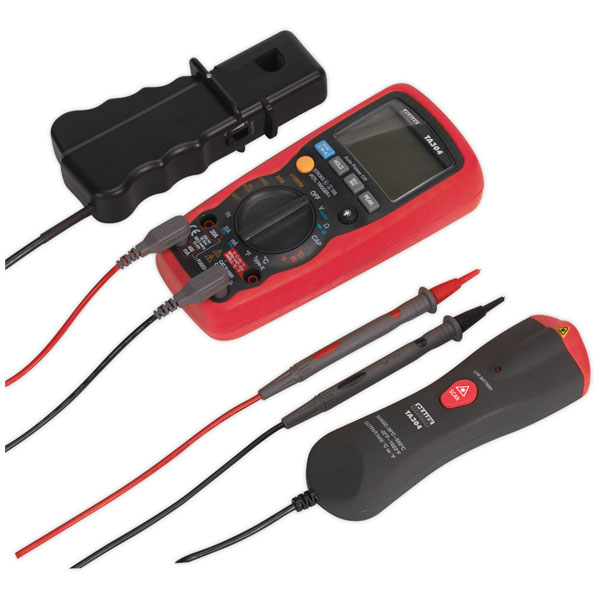 15 Function, auto-ranging automotive diagnostic multimeter with IR thermometer attachment. Combination digital/bar graph display gives accurate indication of component outputs. Large, easy-to-read high contrast display with bright, white back light. Workshop-tough, durable case with integral stand and auto power shut-off. High speed processing circuitry reads standard automotive parameters including duty cycle and pulse width making this tool ideal for testing fuel injection systems. Features auto-ranging, and data-hold functions with overload protection on all ranges. Includes relative functions including min./max. and peak hold. Supplied with inductive coupler, infrared temperature probe, test probes and thermocouple in storage case.