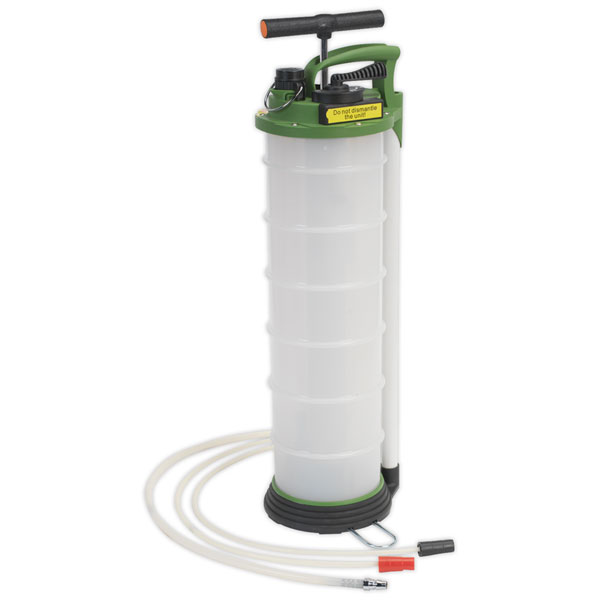 6L Capacity device constructed from composite materials and suitable for extraction of all types of engine, transmission and lubricating oils from cars, motorcycles, marine engines, stationary engines and industrial machinery. Features a controlled discharge function for emptying the unit. Also suitable for low viscosity fluids such as water. Supplied with Ø5.8, Ø6.7mm suction probes and a 1m extension tube. Uses probes to drain engine oil through the dipstick hole. Also suitable for draining fish tanks, basins and sinks.