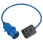 Fused adaptor converts 16Amp round socket to traditional 13Amp 3 pin socket.