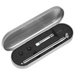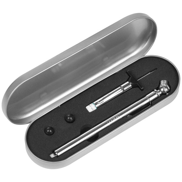 Durable protective metal case with an EVA foam insert and two spare tyre valve caps.