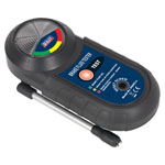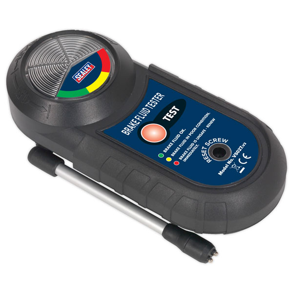 Comparative electrolytic type tester. Checks moisture content of fluid by resistance to electric current. Easily calibrated using new brake fluid. Audible test cycle with three LED read-out. Just insert probe and press button for immediate result. Works on DOT 3, 4 and 5.1 specification fluids. Powered by a 9V battery (not included).