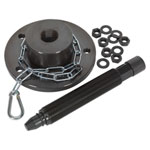 Engineered for safe removal of rear hubs on front wheel drive Ford Transits. Fixes onto the vehicle wheel studs. Features a cleverly designed impact force screw for the separation of the hub from the stub axle. Supplied with snap hook chain for added safety.