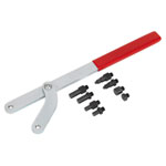 Designed to remove and install fan clutch and rotate or restrain the camshaft pulley. Adjustable jaw spread and interchangeable pins.