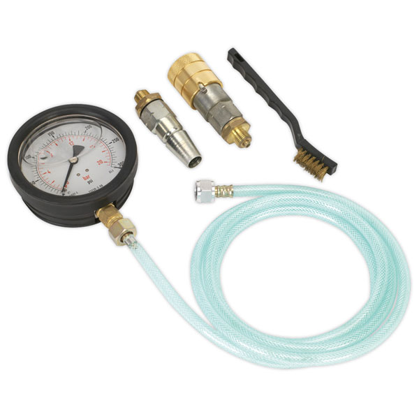 Locate problems relating to commercial vehicle air brake pressure quickly and easily. Suitable for use at the roadside or workshop. Features a large 0-20bar(0-300psi) gauge with rubber bumper and hose. Supplied with wire brush and male and female couplings in storage case.