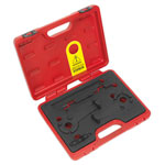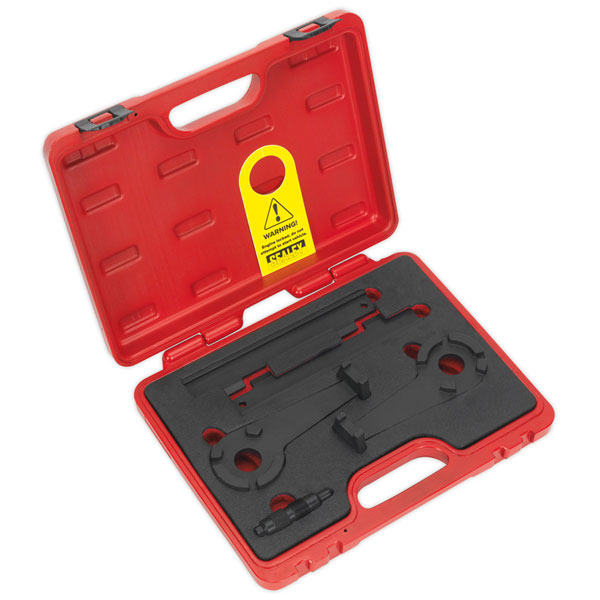 Kit includes camshaft setting plates, camshaft positioning sensor alignment tools and crankshaft locking pin. Supplied in a storage box with warning tag and comprehensive instructions.