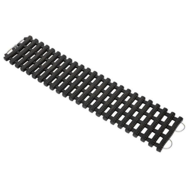 Heavy-duty vehicle traction track designed to prevent wheels spinning on snow, sand and mud. Flexible PVC design allows track to sit smooth against uneven surfaces. Fitted with galvanized steel cable and deep ribbed slatted cleats providing maximum grip. Each track can support a maximum safe working load of 3.5tonne. Supplied as singles in canvas storage pouch.