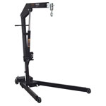 Fast folding for easy storage and transportation. Heavy-duty castors. Pump access from side. Quick lift feature brings unladen jib to full elevation with nineteen strokes of the handle. At maximum jib extension of 1020mm, crane lifts 600kg. Designed for heavy professional use and fitted with dead man's control. Base has four wheels for greater manoeuvrability when folded.