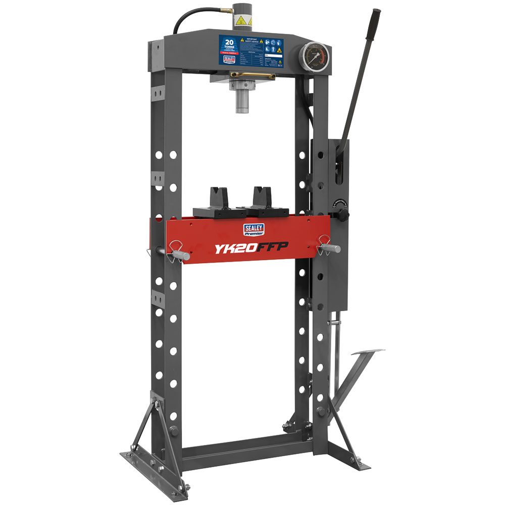 Steel frame construction with speed/torque adjustable hydraulic pump unit featuring manual handle and foot pedal. Sliding hydraulic ram assembly gives 179mm of lateral travel for off-centre pressing applications. Frame head fitted with ram pressure gauge. Supplied with flat pressing plate/V-blocks.