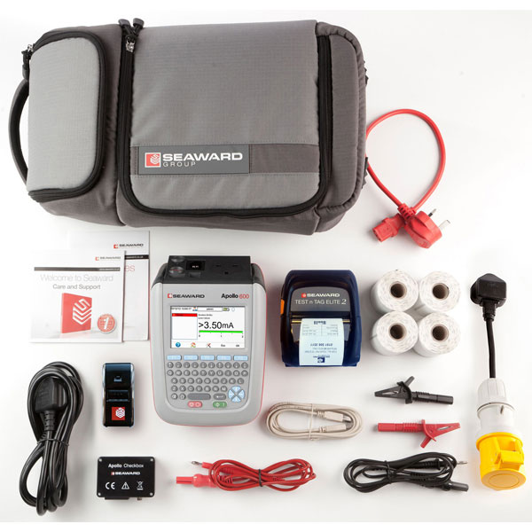 Apollo 600 Elite Kit contains: Apollo 600 PAT tester plus standard accessories Test 'n' Tag Elite 2 portable printer 4x Test 'n' Tag printer 25 x 52mm label rolls Bluetooth barcode scanner Apollo kit carry case 110V adapter