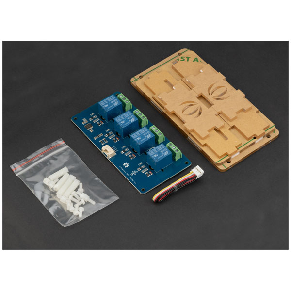 Seeed 103020133 Grove - 4-Channel SPDT Relay - This Single Pole Double Throw SPDT relay is quite useful in certain applications because it has one common terminal and 2 contacts which are great for selecting between two options.
