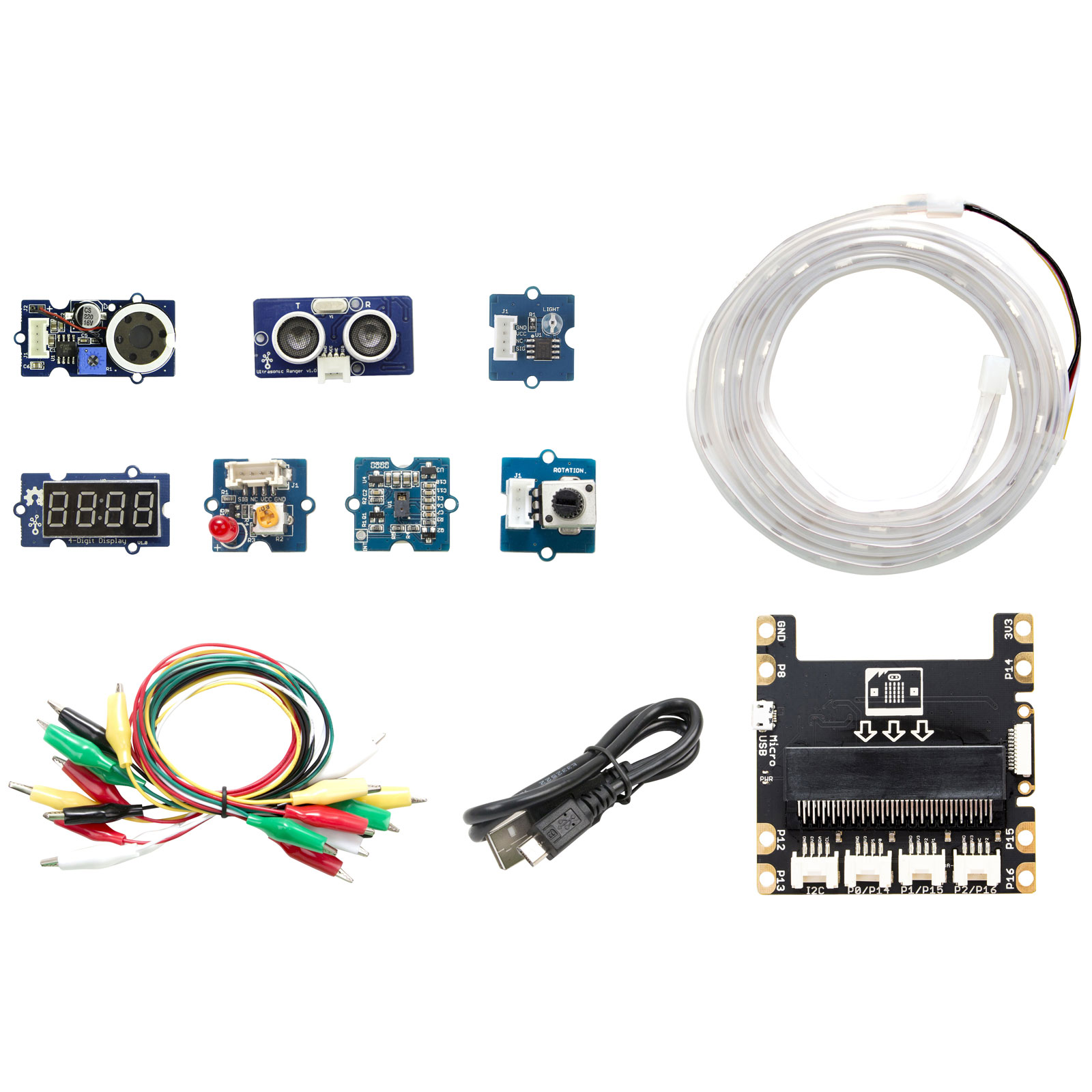 The kit contains eight Grove modules that will get you going with your micro:bit. You'll be able to measure distance and display the results, use gestures to play music, or make a smart security system for your room.