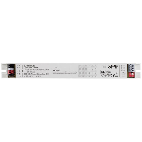 The Self Electronics SLT160-700IL-EU LED driver is a 160 W constant current power supply with adjustable output ranging from 350 to 700 mA and 120 to 228 V DC. It is suitable for use on flammable surfaces, approved for use on furniture, and includes surge protection. This LED driver is ideal for non-dimmable LED lighting applications, such as powering LED strips.