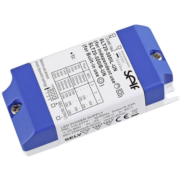 The Self Electronics SLT20-500IL-UN LED driver is a constant current power supply with a 20 W output and adjustable current from 150 to 500 mA. It features surge protection and is approved for use on furniture, though it is not dimmable. This LED driver is typically used for powering LED strips or similar applications.