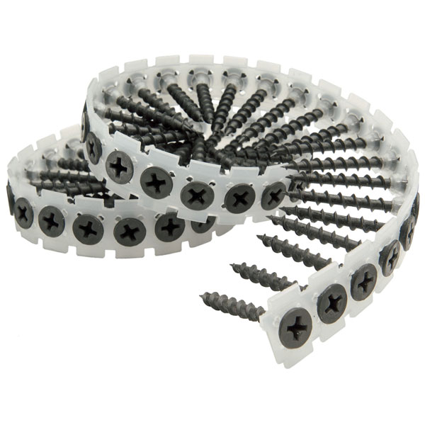 Senco DuraSpin® Collated Screws for Drywall to Wood applications. Phillips No.2 drive, black phosphate finish, coarse thread, bugle head. 50 screws per strip.