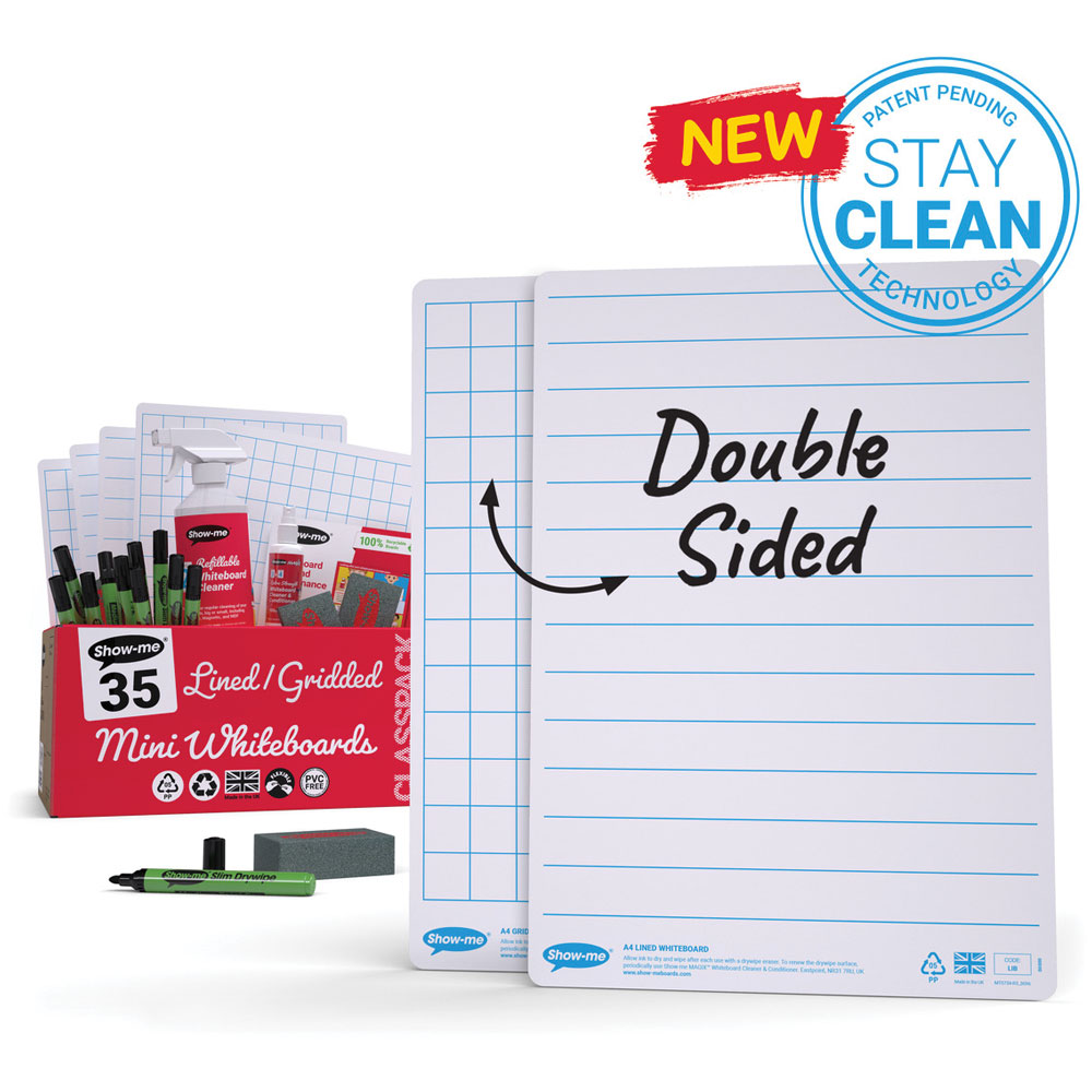 Great value Classpack of A4 Lined/Gridded Whiteboards, with 35 sets. Each set has 1 board, marker and eraser plus 2 free cleaners and a helpful guide to get the most out of your whiteboards. Plastic free, fully recyclable packaging.