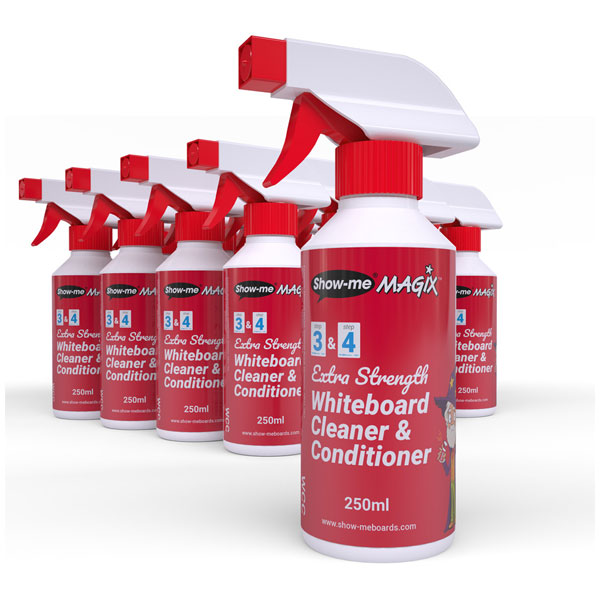 Never have dirty whiteboards again with Show-me MAGIX Whiteboard Restorer and Conditioner. Ideal for use on wall-mounted and individual drywipe boards, it's two products in one. Each application effortlessly removes ghosting, stubborn staining, ballpoint ink and permanent marker with ease. The unique STAYCLEAN ingredient adds a conditioning microfilm layer, which improves the erasability and gives a far smoother writing experience. This is not recommended for regular cleaning - choose Show-me Stage 2 cleaner for this. Pack contains 16 x 250ml trigger spray bottle of Show-me MAGIX.
