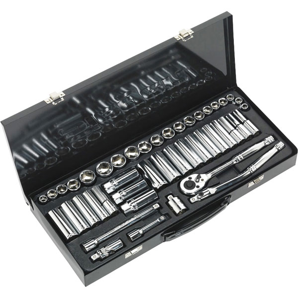 A 45-piece socket set from Siegen featuring high grade carbon steel standard and deep WallDrive® sockets and accessories. Hardened and tempered with a fully polished finish for corrosion resistance. Chrome vanadium steel 45-tooth pear-head flip reverse ratchet wrench with quick socket release.