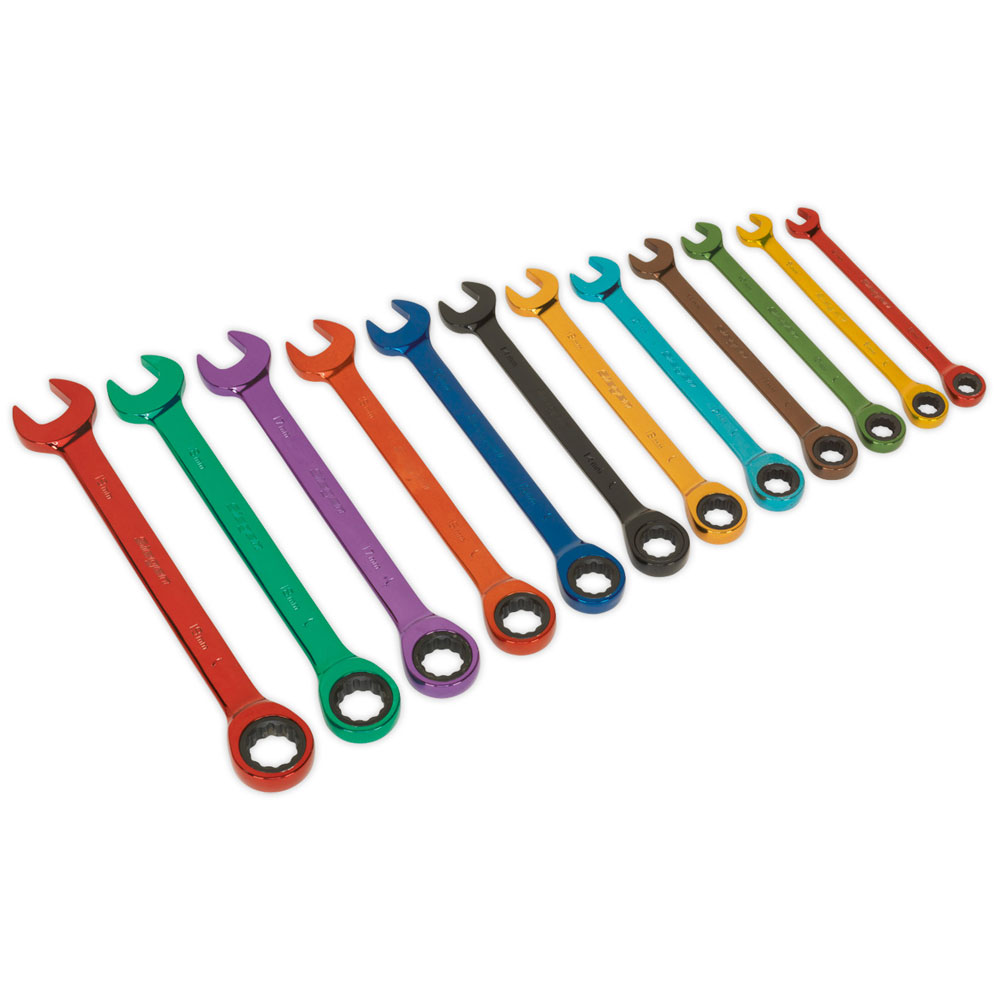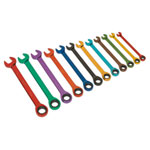 Multi-coloured, Chrome Vanadium steel ratchet combination spanner set. Hardened, tempered and chrome plated for corrosion resistance. Fully polished with a coloured mirror finish. Open end and 12-point WallDrive® ring combination. 72-Tooth, ratchet ring and gear set requiring only 5º rotation to pick up next ratchet tooth, ideal for applications where space is limited. Supplied in storage/carry rack.