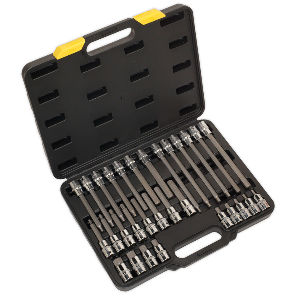 Chrome Vanadium steel sockets and hex bits. Sockets are heat treated and chrome plated for resistance to corrosion. Fully polished finish with knurled ring to assist gripping with oily fingers. Supplied in storage case.