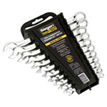 Drop-forged Chrome Vanadium steel combination spanners heat treated and chrome plated for corrosion resistance. Open end and 12-point WallDrive® ring combination. Supplied in storage/carry rack.
