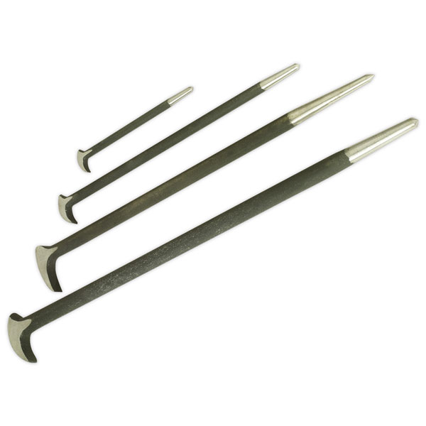 Drop-forged, heat treated steel shafts with blackened finish. Tapered shaft suitable for lining up components prior to assembly. Heel design maximizes leverage. Also useful for fine positioning of heavy machinery.