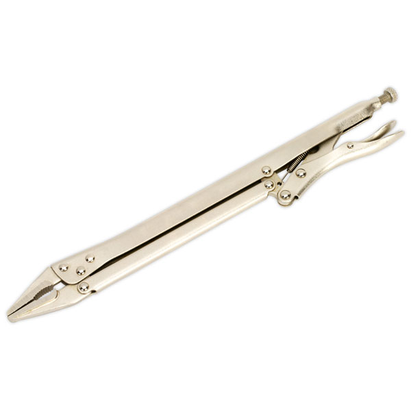 Drop-forged and heat treated steel with a bright nickel plate finish. Extra-long 375mm locking pliers for use where access is limited. Deeply serrated, adjustable grip jaws with lever release.