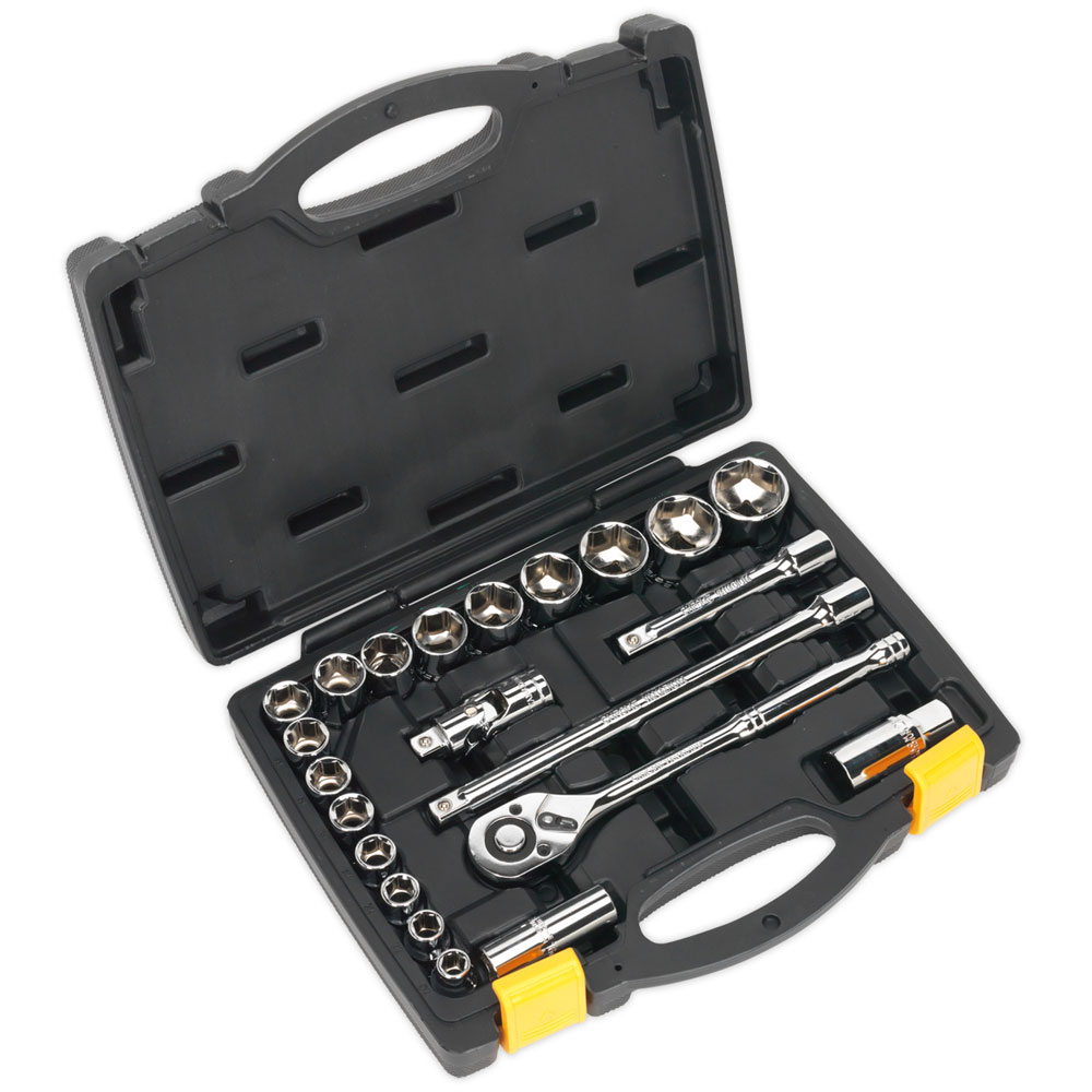 High grade carbon steel WallDrive® sockets and accessories. Chrome Vanadium steel 45-tooth pear-head flip reverse ratchet wrench with quick socket release. Hardened and tempered with a fully polished finish for corrosion resistance. Supplied in storage case.