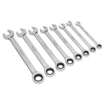 Chrome Vanadium steel combination ratchet spanner set. 72-Tooth ratchet ring and gear set requiring only 5° rotation to pick up next ratchet tooth, ideal for applications where space is limited. Supplied in storage rack.
