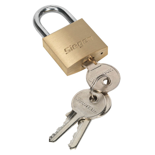 A 30mm brass body padlock from Siegen with hardened and plated steel shackle. Featuring a brass cylinder with twin bar locking mechanism, while supplied with three keys.