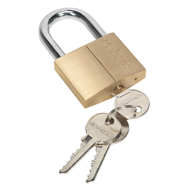 A 50mm brass body padlock from Siegen with hardened and plated extra-long steel shackle. Featuring a brass cylinder with twin bar locking mechanism, while supplied with three keys.