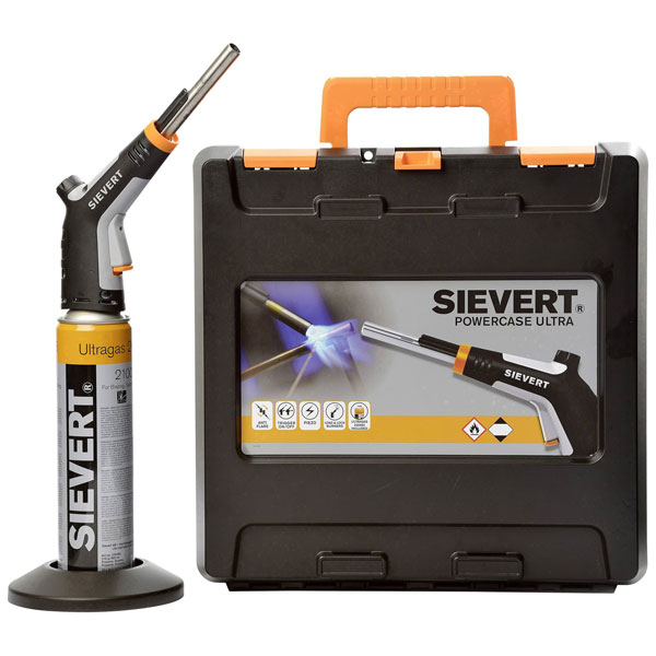 The Sievert Powercase Ultra is a high-performance gas burner capable of reaching temperatures up to 2100 °C. This blow torch includes a gas bottle, making it ideal for brazing and soldering applications. Manufactured by Sievert, it offers reliable efficiency for both professional and DIY use.