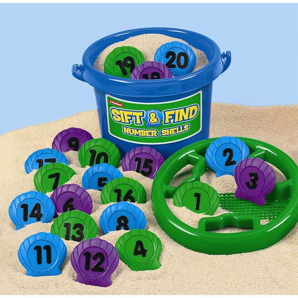 This sift and find number shells from Lakeshore are a fantastic fun way for children to enjoy numbers and mathematics. The unique shells, printed with numbers 1-20, are not only an excellent way to reinforce early math concepts, but they also strengthen early number skills during sand play activities. Includes 20 plastic shells, storage bucket with sieve lid and teachers guide.