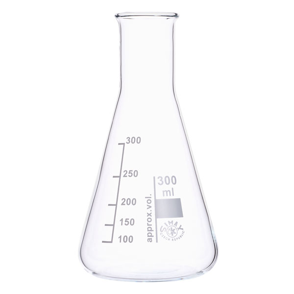 Glass conical flasks from Simax with narrow necks and white graduations.