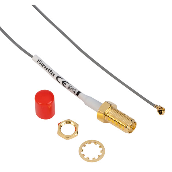 A pre-assembled cable from Siretta, featuring a UFL male plug on one end and a reverse polarity SMA female bulkhead socket on the other.