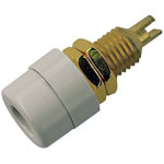White 4mm gold-plated brass sockets from SKS Hirschmann, with insulated head and ring for installation in equipment chassis and switch panels with a wall thickness up to 2mm.