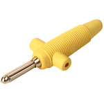 Yellow multiple-spring 4mm wire bunch plug from SKS Hirschmann's BUELA 300 K Series, shatterproof and with a flexible insulated sleeve with transverse hole. Lateral supports provide protection against contact when plugged in at right angles. The tapering sleeve end also serves as kinking protection for the lead.