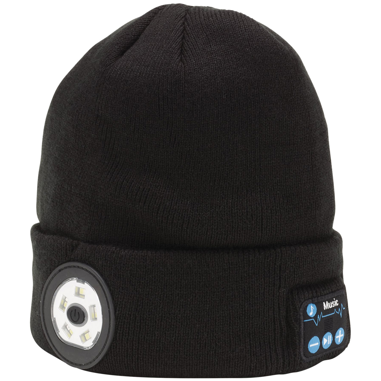 This smart black beanie hat has a built-in head torch and wireless headset and microphone, for listening to music and making telephone calls.