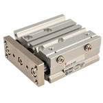 A compact guided pneumatic cylinder that features a shorter guide rod and thinner plate resulting in a 17% weight reduction over the original model. The design of the unit gives a higher load capability, longer stroke, 2x port locations, switch mounting grooves on two sides and a more versatile T-slot mounting than the previous unit. Designed for high side load applications found in material handling, lifting and stopping.