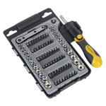 Selection of popular-sized high grade steel sockets and Chrome Vanadium bits. Ratchet screwdriver with button operation to tilt driver ±60° from vertical, integral bits storage and comfort grip handle. Includes mini ratchet driver and adaptor. Supplied in storage case.