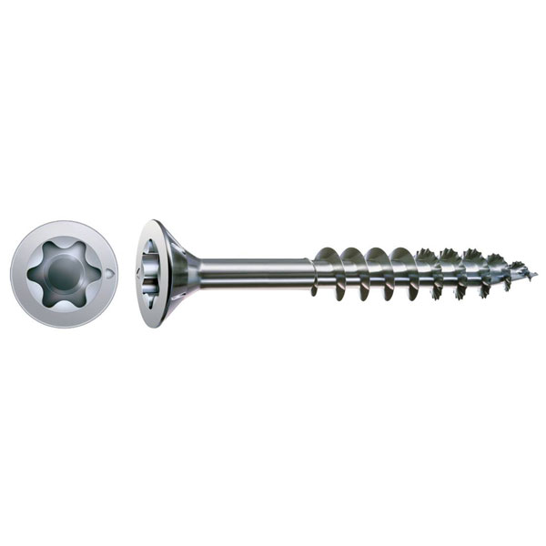 The flat countersunk head has a polygonal underside ("pockets") that mills its way into the wood and can therefore be countersunk without having to pre-drill the screw hole.