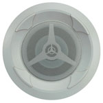 A ceiling speaker with a tilt and swivel chassis. The speaker is mounted via threaded clamps that fix the speaker to the edge of the hole. The metal grille not only looks attractive, but also protects the speaker from dirt and damage.
